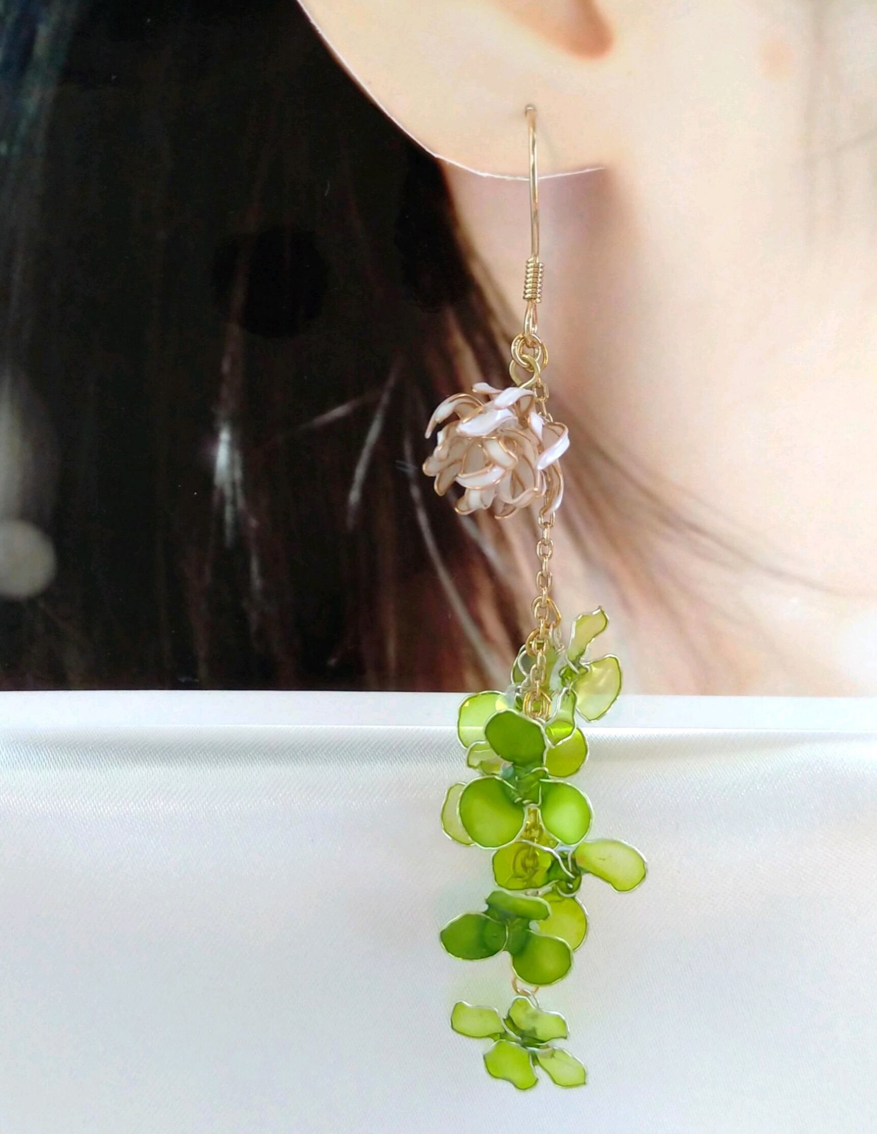 耳元にクローバーが揺れて、華やかさをプラスしてくれます。ディップアートなので、とても軽く、長時間つけていても着け心地がいいです。