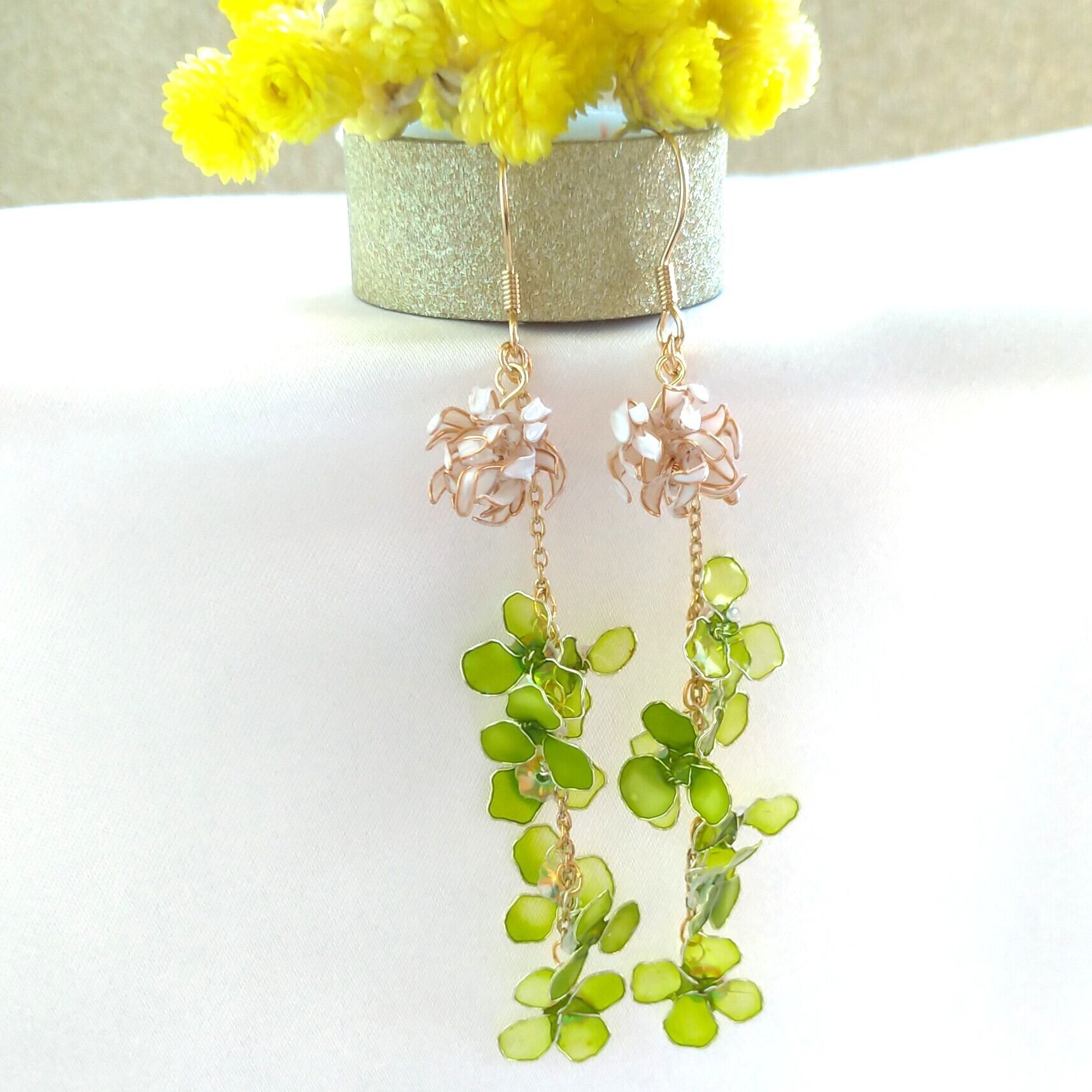 ひらひら揺れるクローバーが春を感じさせる、ディップアートで作成した揺れるピアスです。