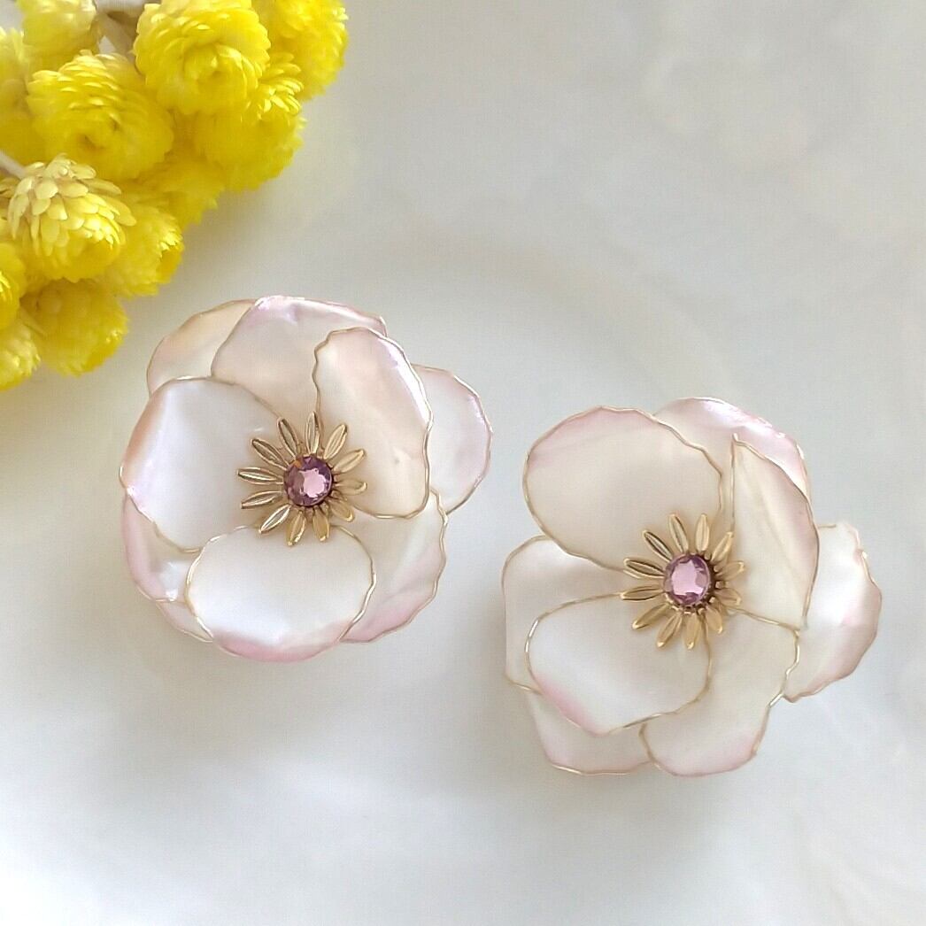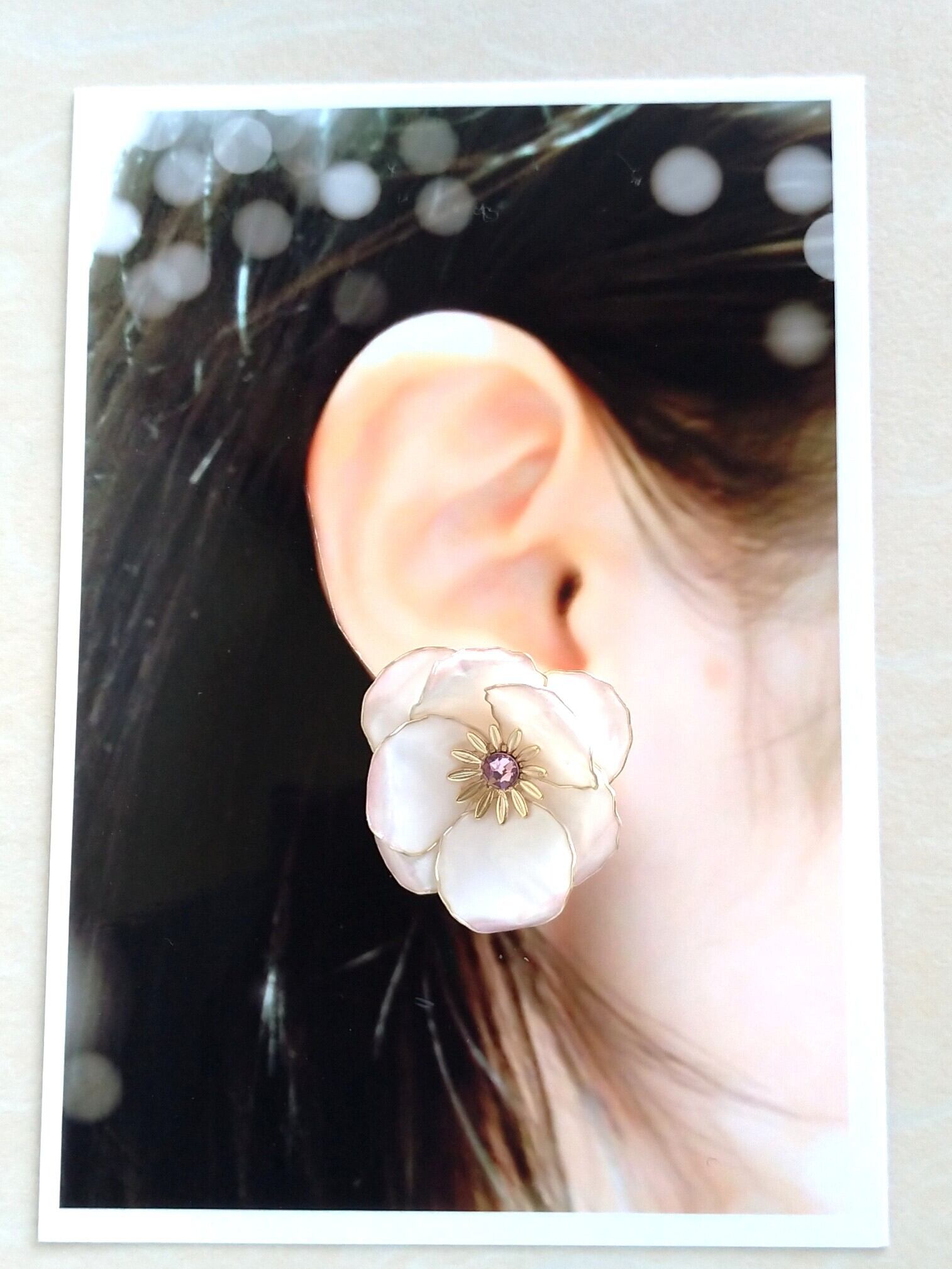 ホワイトの花びらのふちのパールがかったパープルの色味の組み合わせが、とても上品で耳元を華やかにしてくれます。