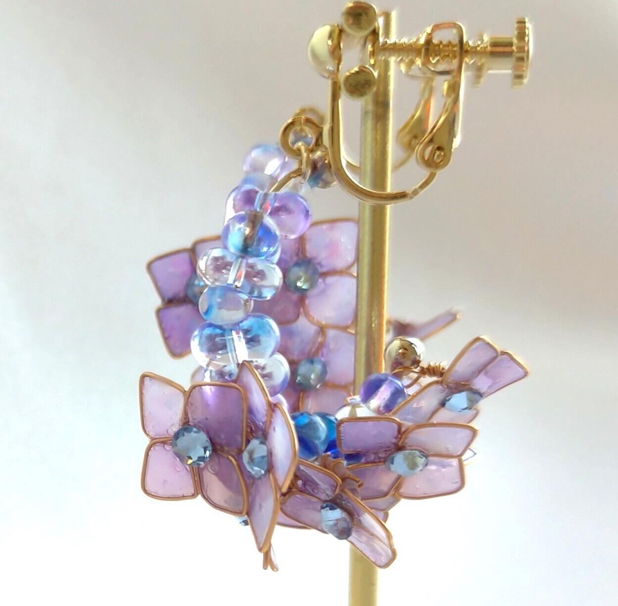 耳元に花が咲いて、揺れる紫陽花が華やかさをプラスしてくれます。ディップアートなので、とても軽く、長時間つけていても着け心地がいいです。