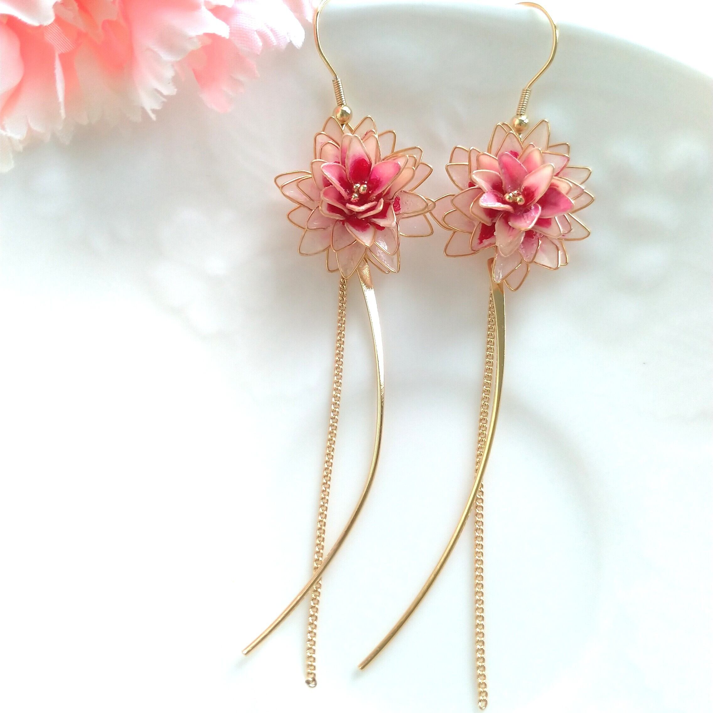 ダリアが可愛らしい、ディップアートで作成したピアスです。流れるような曲線と揺れるチェーンの組み合わせが華やかで、耳元に華やかさをプラスしてくれます。
