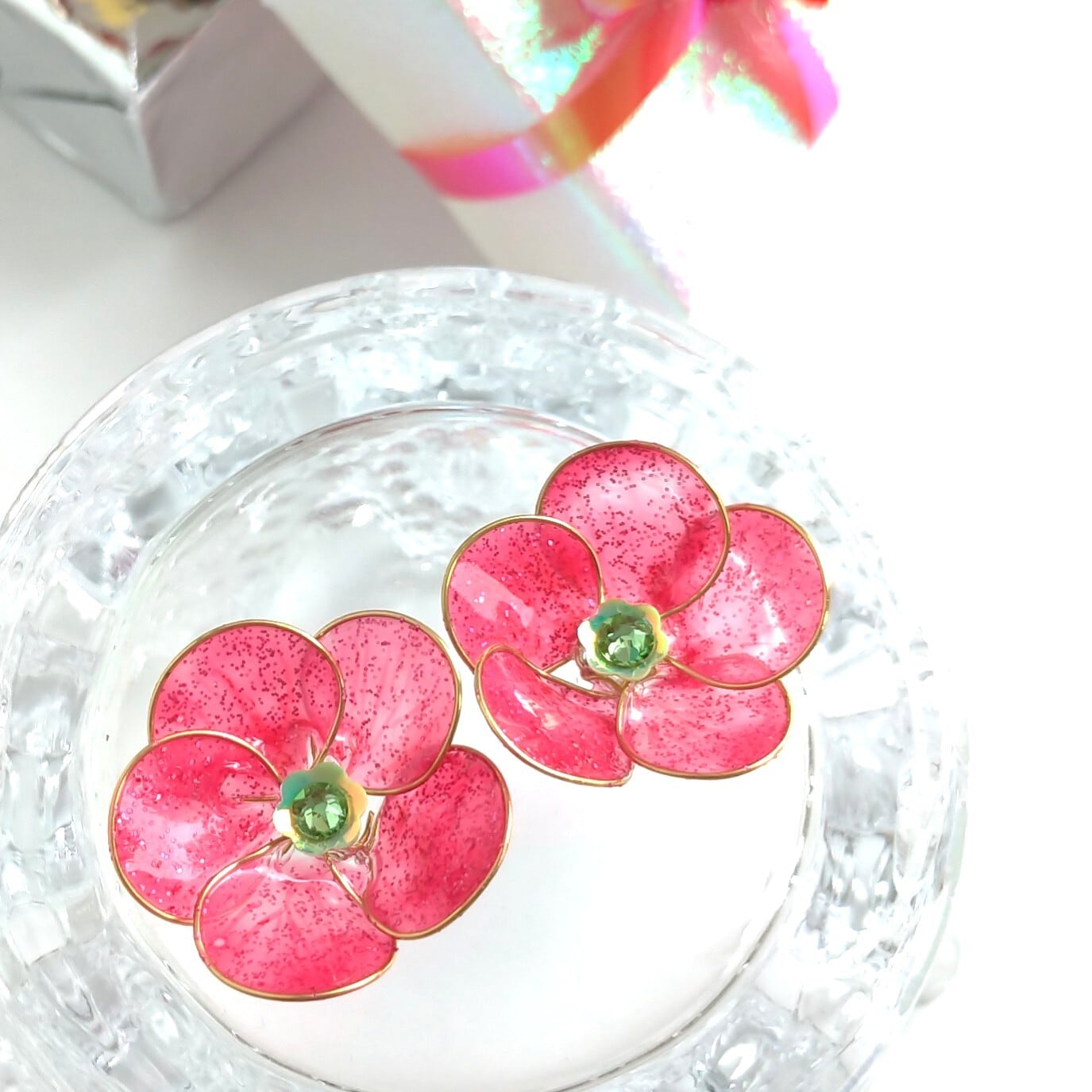 ピンク色のオキザリスが可愛らしい、ディップアートで作成した耳飾りです。