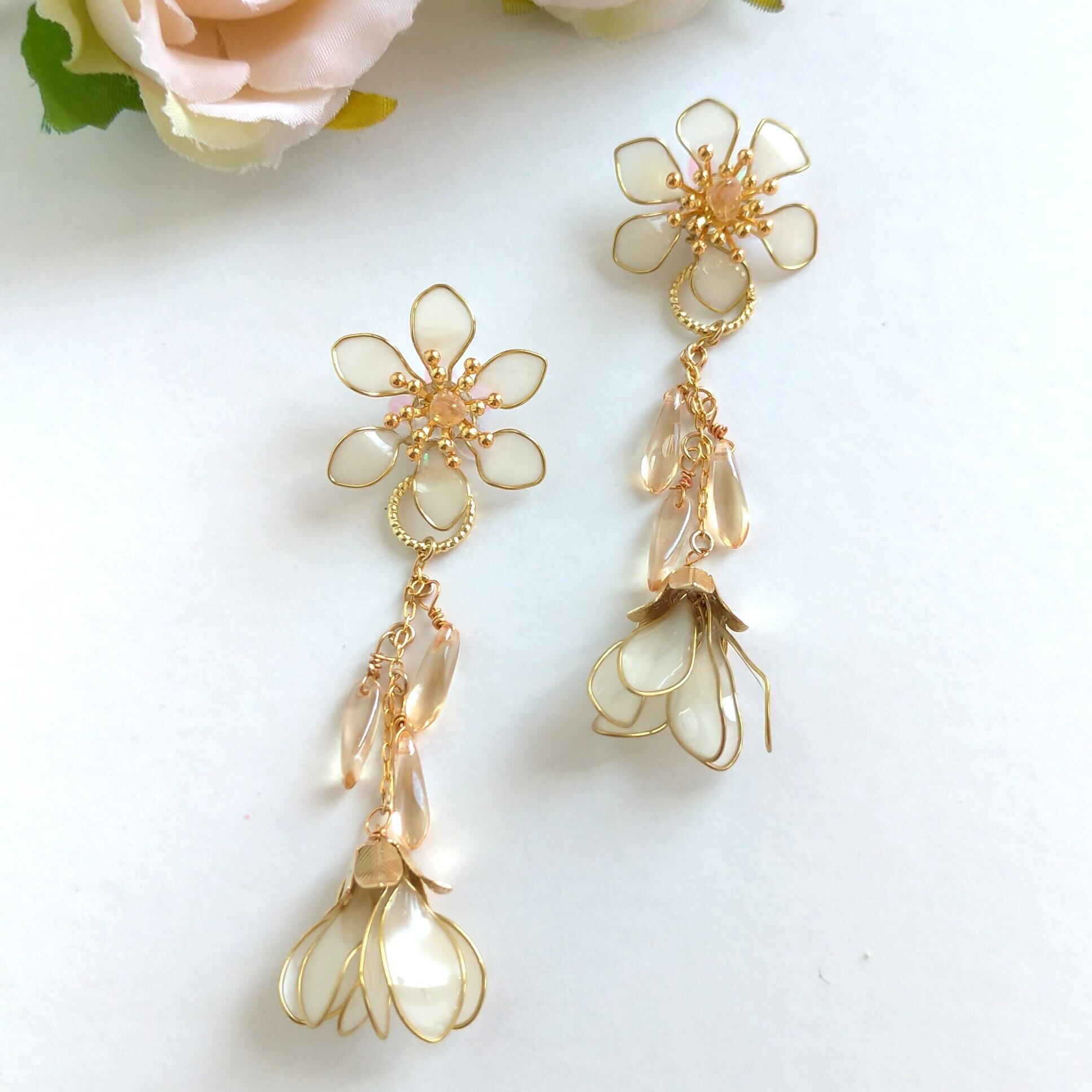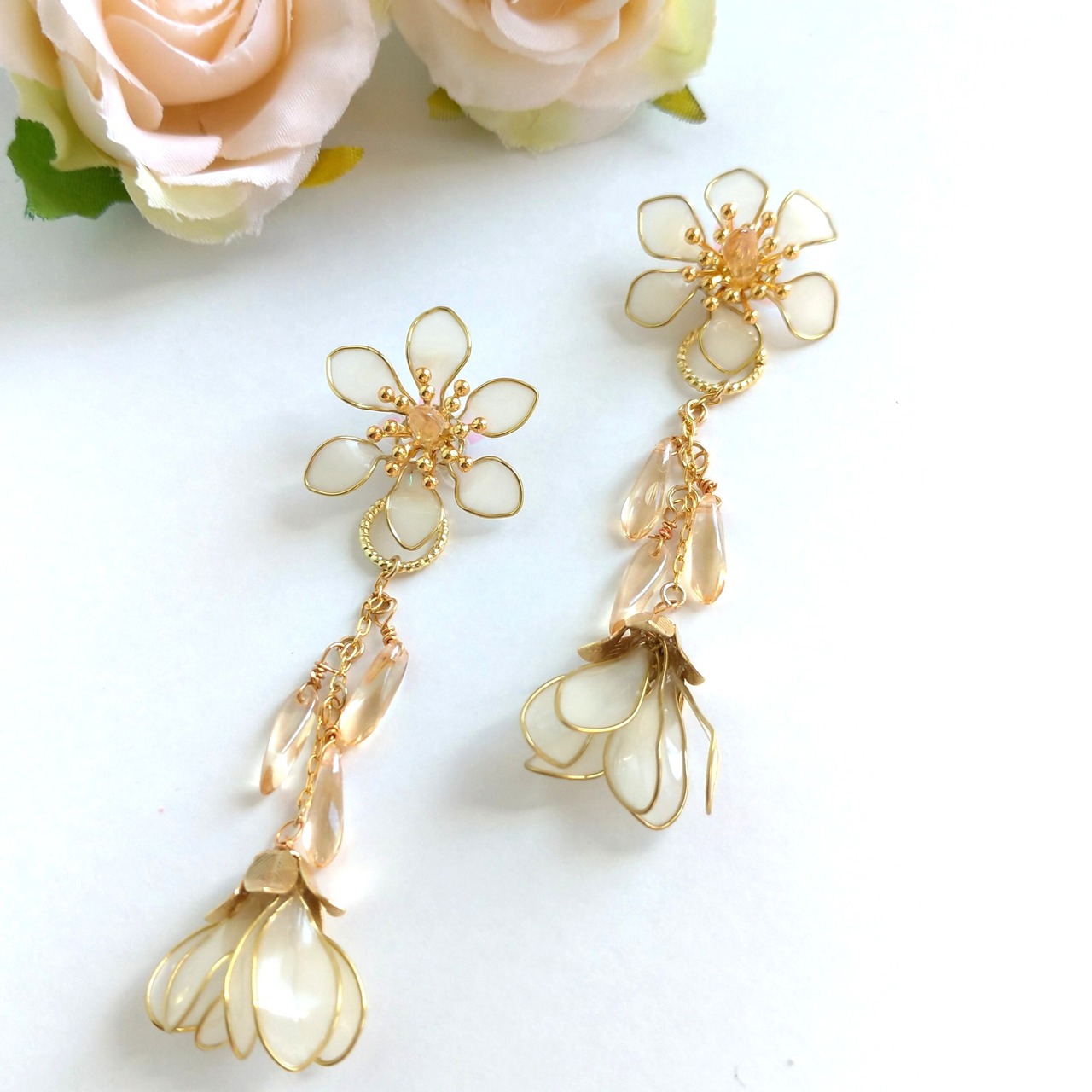 コブシの花をイメージした、ディップアートで作成した耳飾りです。乳白色の花びらが優しい色合いで、どんなファッションにもあわせやすいアクセサリーです。
