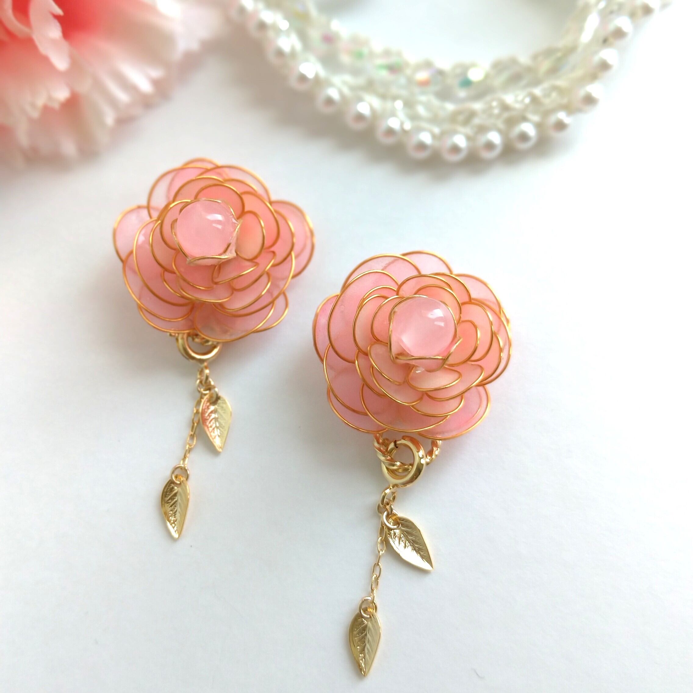 ピンク色の淡い椿が上品な、ディップアートで作成したオトメツバキのイヤリングです。優しい色合いの花びらが耳元を華やかにしてくれます。