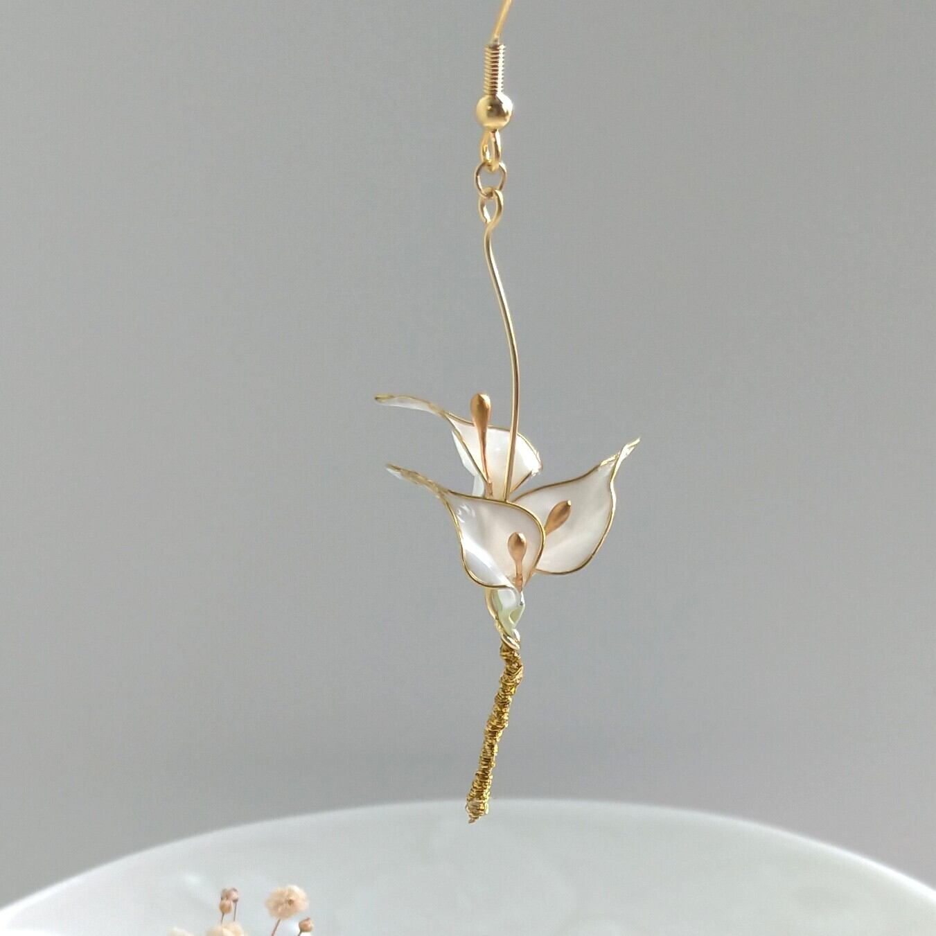 カラーをモチーフにしたピアスです。ブーケのようにまとめ、シンプルながらも上品なデザインに仕上げました。