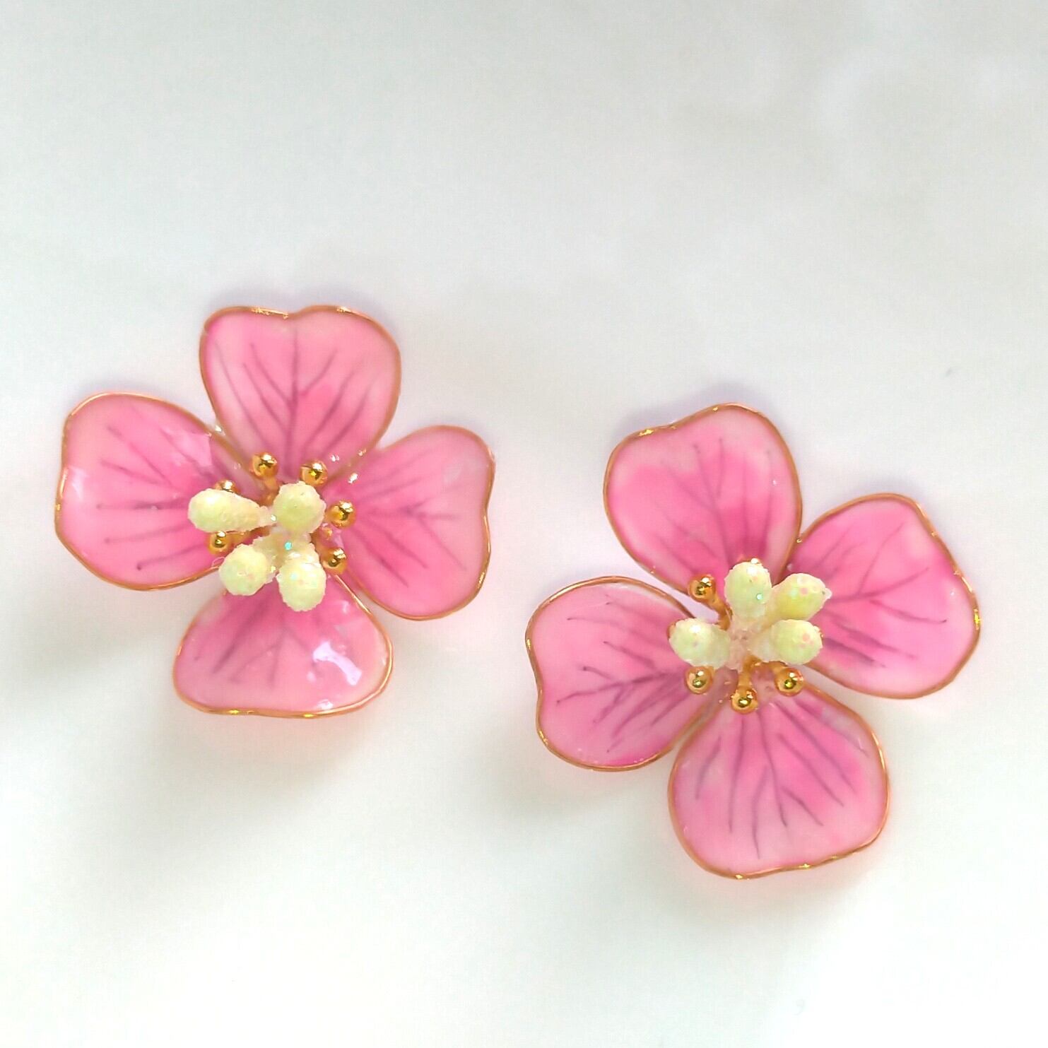 淡いピンクの透き通るような花びらが上品な、ディップアートで作成したイヤリングです。鮮やかな色合いの花びらが耳元を華やかにしてくれます。