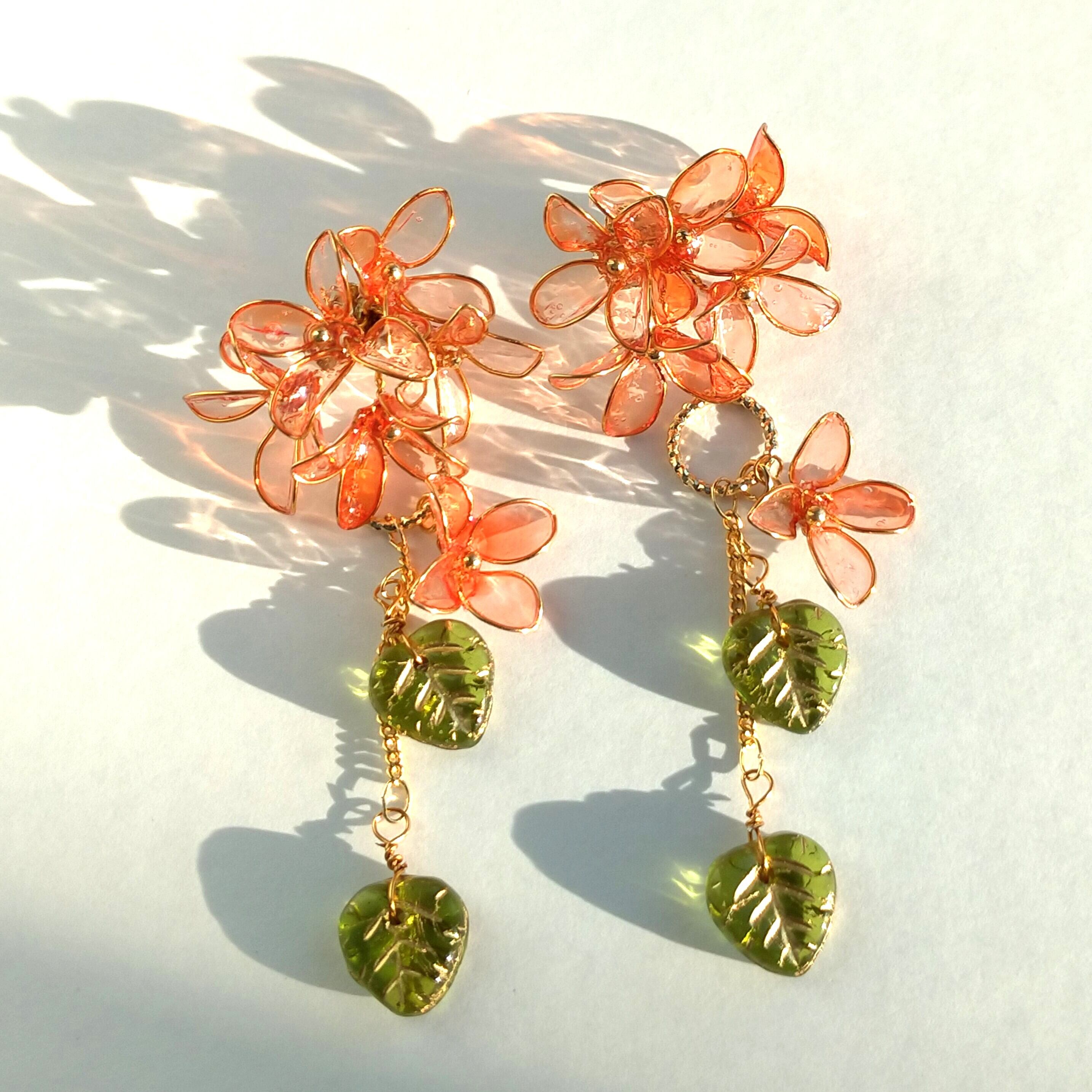 オレンジ色の透き通るような花びらが上品な、ディップアートで作成したピアスです。透明感があるので、光に当たるとキラキラ輝きます。