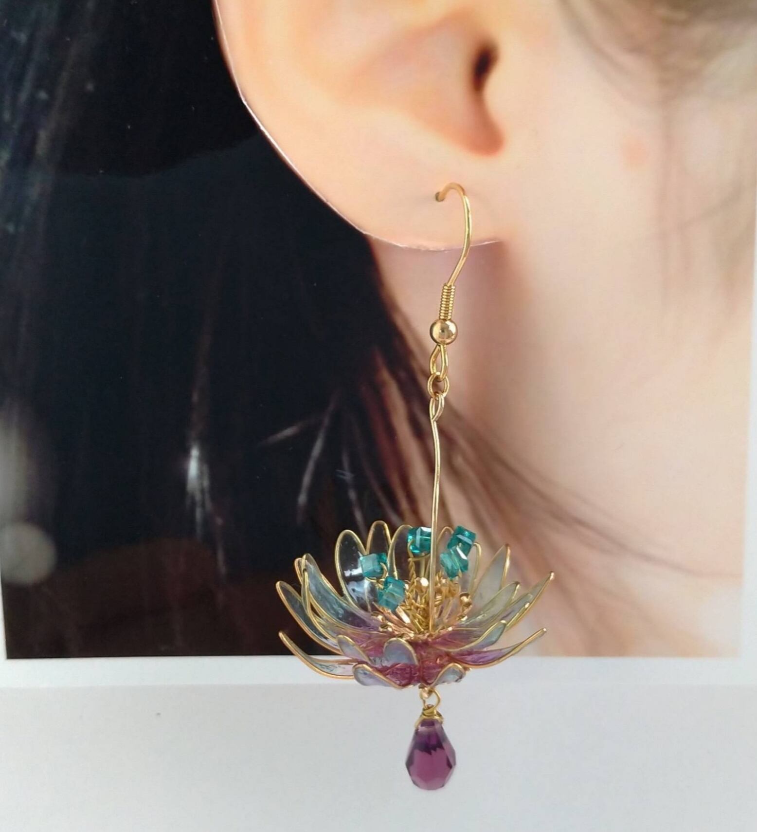 睡蓮が揺れる、可愛らしいディップアートで作成したピアスです。睡蓮の透き通るような花びらが上品な印象を与え、耳元に華やかさをプラスしてくれます。