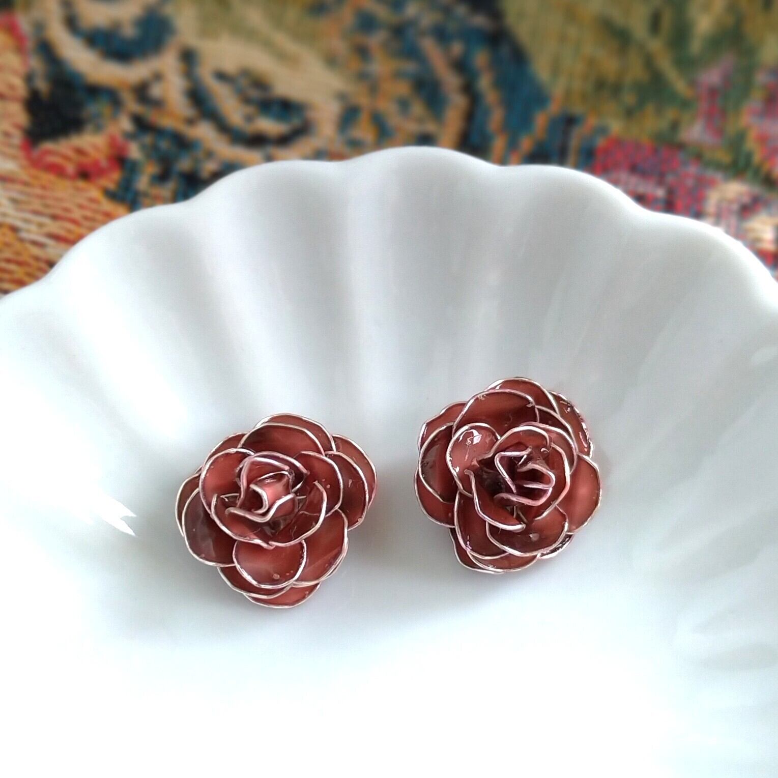 温かみのあるオレンジブラウンの花びらが上品な、ディップアートで作成したミニバラのイヤリングです。優しい色合いの花びらが耳元を華やかにしてくれます。
