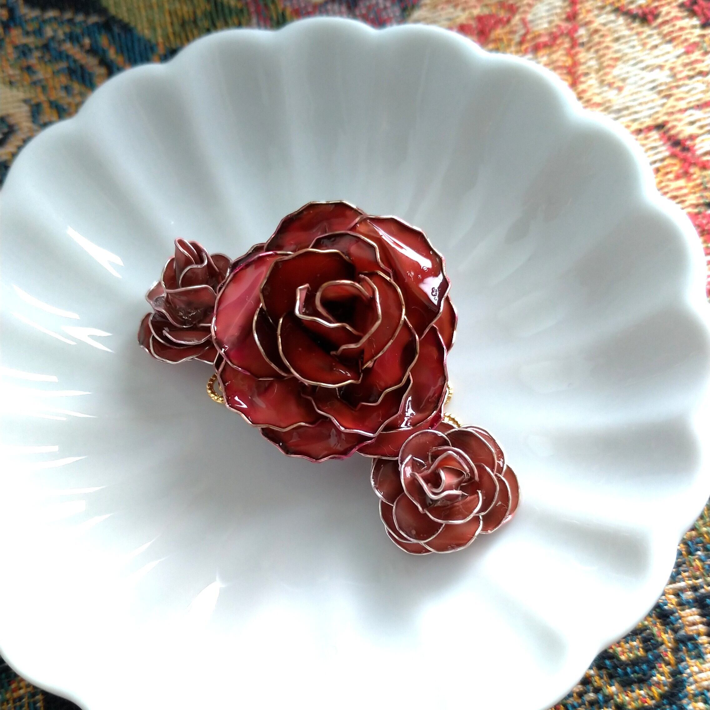 温かみのあるオレンジブラウンの花びらが上品な、ディップアートで作成したミニバラのイヤリングです。優しい色合いの花びらが耳元を華やかにしてくれます。