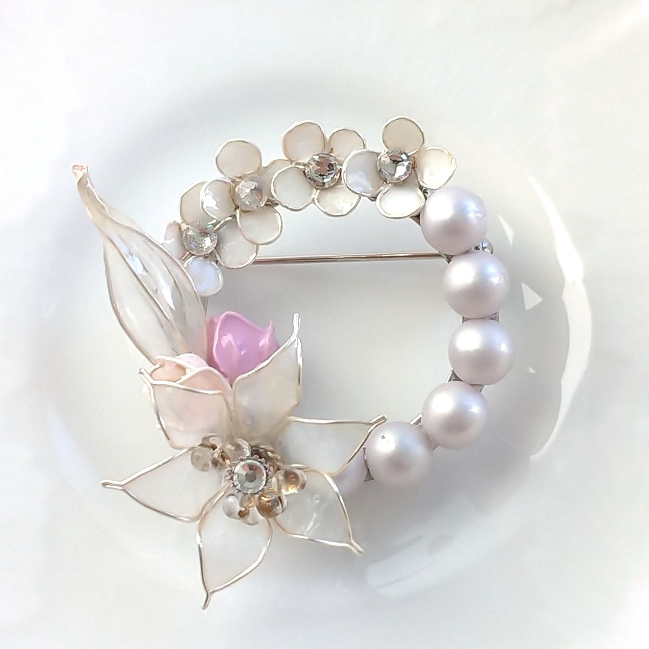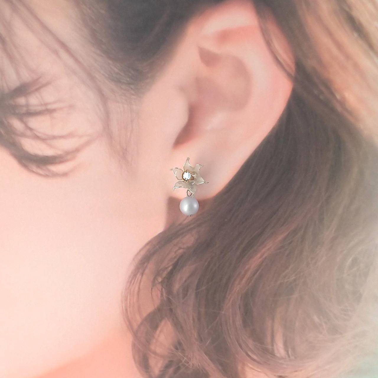 イヤリングは繊細なユリの花びらと上品なパールが組み合わさり、華やかさと落ち着きを兼ね備えたデザインに仕上げました。ブローチはユリを中心に、小花とパールの輪を配置し、エレガントな仕上がりになっています。